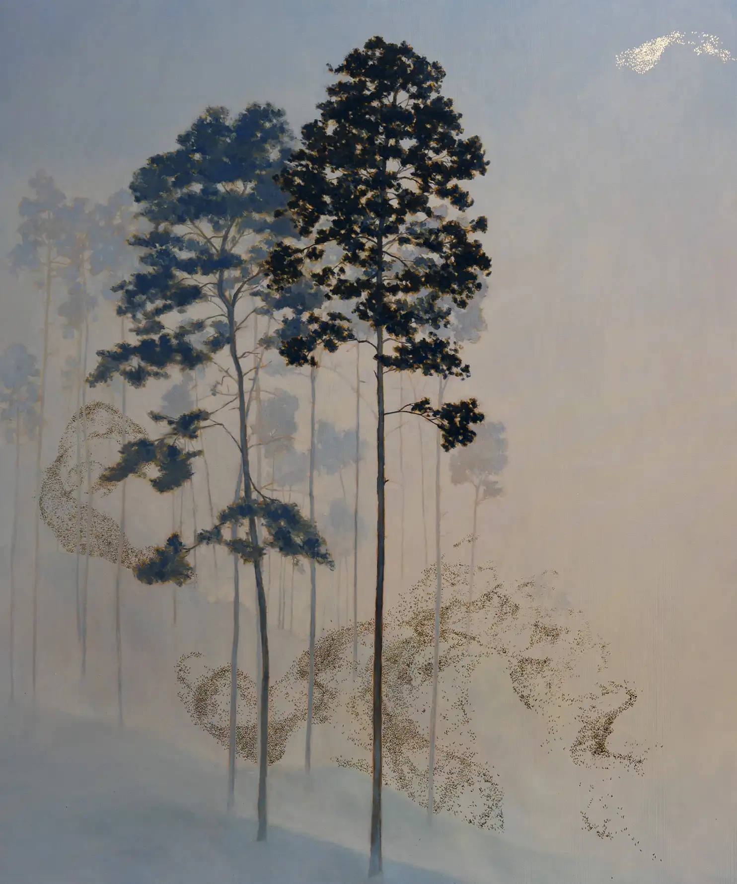 Hampel’s original works, in particular his signature gold-leaf Murmurations, are extended through discreet layers of light and movement. Birds appear and dissolve slowly, their motion registering peripherally rather than demanding attention. The technology introduces change without spectacle, allowing the work to shift without interrupting the surrounding space.
